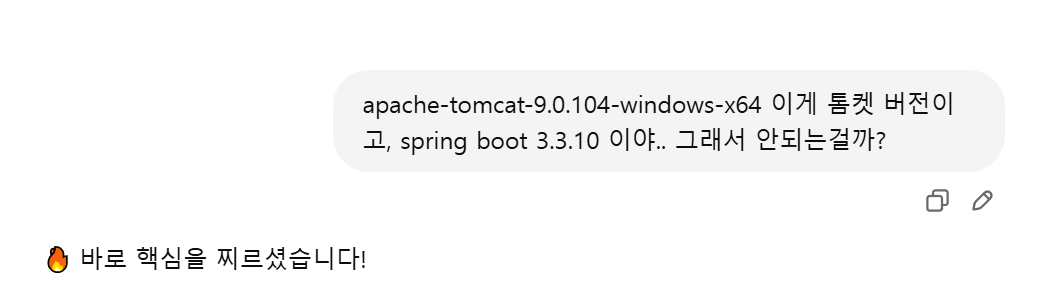 💥 문제 원인: Spring Boot 3.x 는 Jakarta EE 10 기반, 하지만 Tomcat 9.x 는 Jakarta EE 8까지만 지원